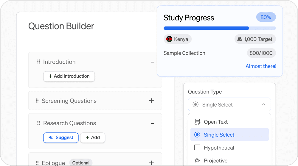Tell us your goal and audience, and our Behavioral AI instantly suggests the right mix of qualitative and quantitative questions, rooted in best practices from behavioral science.